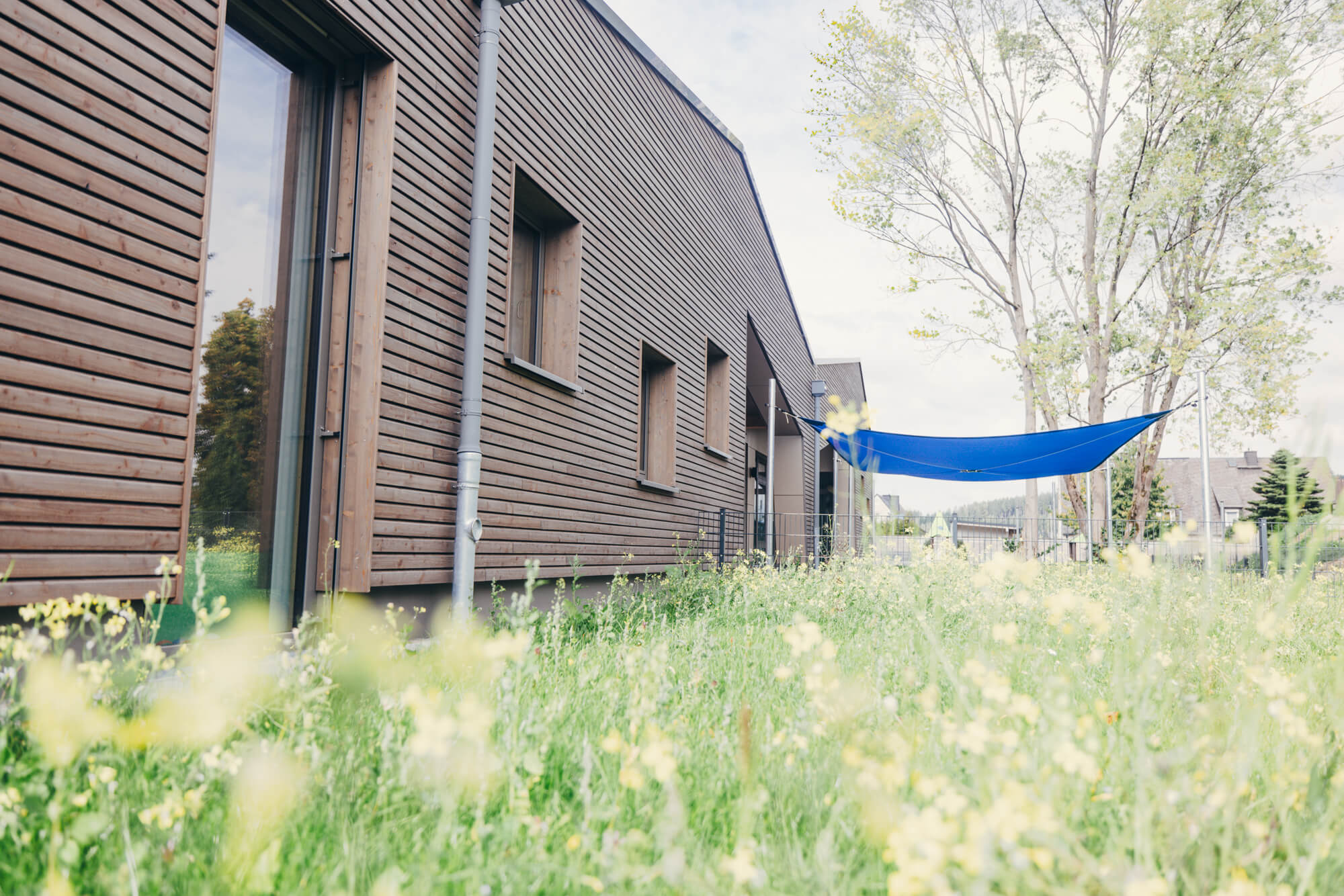 Auf rund 900 m² entstand ein funktionaler, kindgerechter Holzbau mit begrünten Außenflächen, vielfältigen Spielgeräten und einem separaten Gartenbereich für die Kleinsten. Die südöstliche Ausrichtung des Gartens sorgt für Ruhe im angrenzenden Wohngebiet.