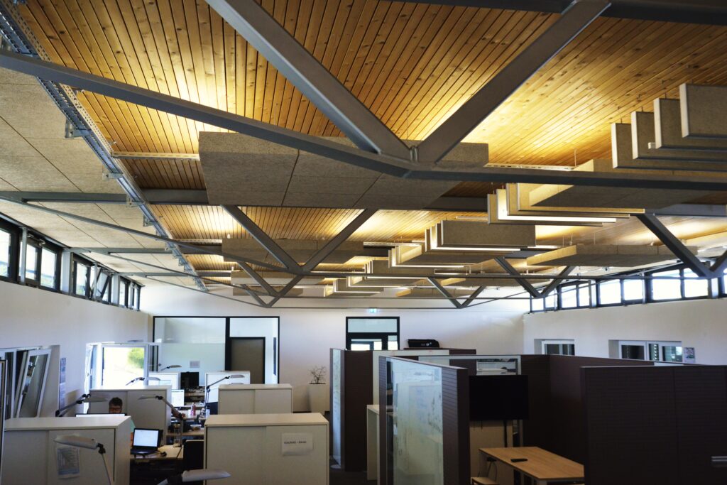 Die Umwandlung einer ehemaligen Konserven- und Senffabrik in ein hochmodernes Bürogebäude ist ein beeindruckendes Beispiel für zukunftsweisende Revitalisierung. Zwischen 2016 und 2017 wurde das historische Gebäude bis auf die Grundmauern zurückgebaut und anschließend komplett neu errichtet, um den Anforderungen eines zeitgemäßen Arbeitsumfeldes gerecht zu werden. Ein besonderes Merkmal ist die freigelegte Holzdecke in Kombination mit den sichtbaren Stahlträgern, die dem Innenraum eine markante industrielle Ästhetik verleiht. Ergänzt wird dies durch innovative Deckensegel mit indirekter Beleuchtung, die nicht nur für eine angenehme Lichtatmosphäre sorgen, sondern auch die Akustik optimieren. Für höchsten Komfort wurde eine flächige Fußbodenheizung installiert. Die äußere Erscheinung des Gebäudes wird durch eine moderne Aluminiumwellenfassade geprägt, die es harmonisch an die bestehenden Bürogebäude auf dem Gelände angleicht und ein kohärentes Gesamtbild schafft. Ein neu geschaffener, einladender Haupteingang mit einer eleganten Treppenanlage empfängt Besucher und Mitarbeiter und rundet das gelungene Transformationsprojekt ab.
