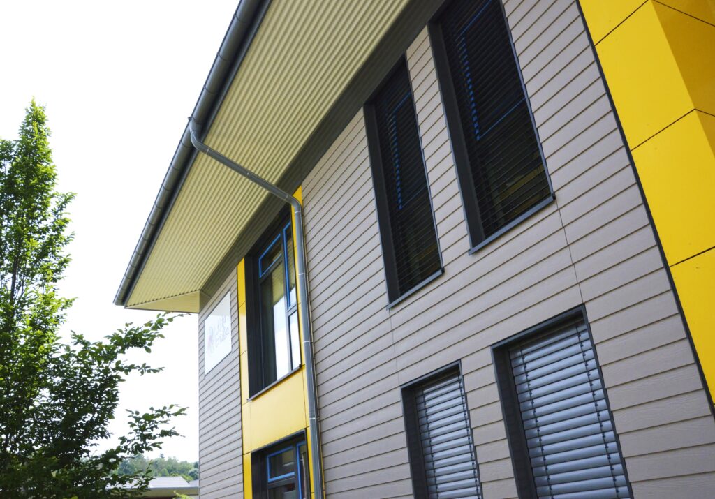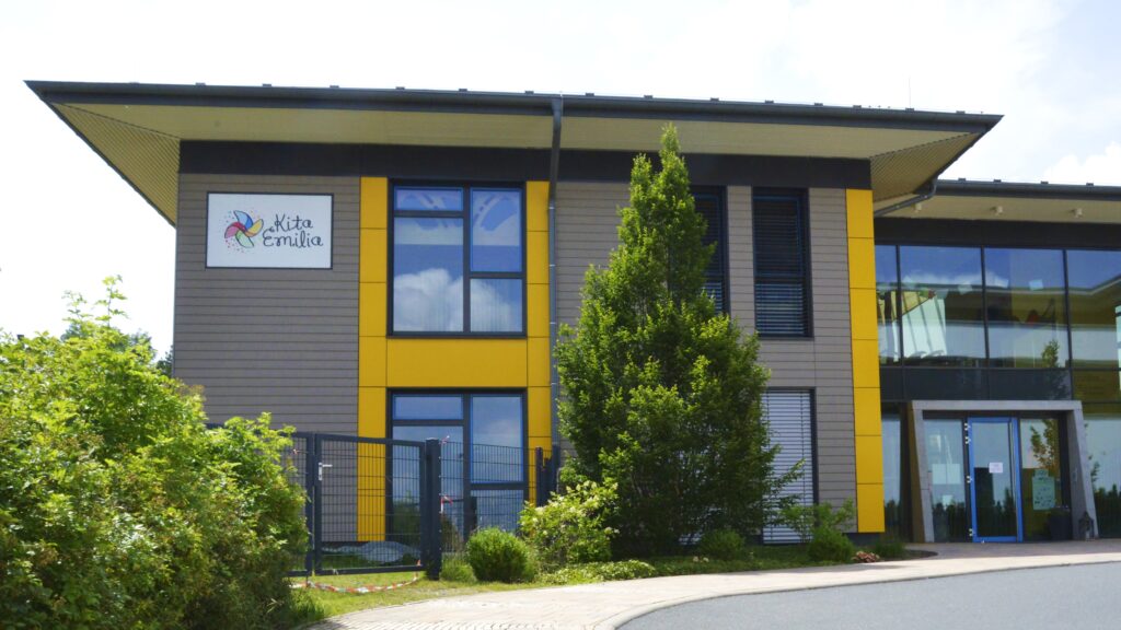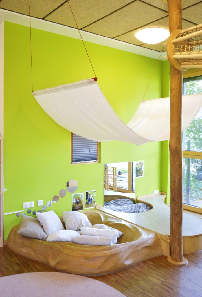 Dieses Kindergartenprojekt, das Platz für zwei Kindergarten- und zwei Krippengruppen bietet, repräsentiert das erste einer Reihe von drei baugleichen Einrichtungen. Die Entscheidung für ein wiederholtes Konzept zeugt von der herausragenden Wirtschaftlichkeit und dem effizienten Grundriss, der den Bauherrn überzeugte. Das Innere des Kindergartens ist geprägt von einer kindgerechten Gestaltung: Helle Räume, akzentuiert durch natürliche Holztöne, schaffen eine freundliche und beruhigende Umgebung. Vielfältige Holzeinbauten laden zu kreativem Spiel ein und bieten zahlreiche Möglichkeiten zum Entdecken. Ein besonderes Element, das die motorische Entwicklung fördert und gleichzeitig den Spielspaß erhöht, ist der Kletterbaum, über den die Kinder das Erdgeschoss und Obergeschoss verbinden können. Der Spielbalkon im Obergeschoss dient nicht nur als notwendiger Fluchtweg, sondern bietet über eine integrierte Rutschanlage einen direkten und aufregenden Übergang in die sorgfältig gestaltete Gartenanlage. Das gesamte Design ist darauf ausgelegt, eine Umgebung zu schaffen, die sowohl sicher ist als auch die kindliche Neugier und Freude am Lernen unterstützt.
