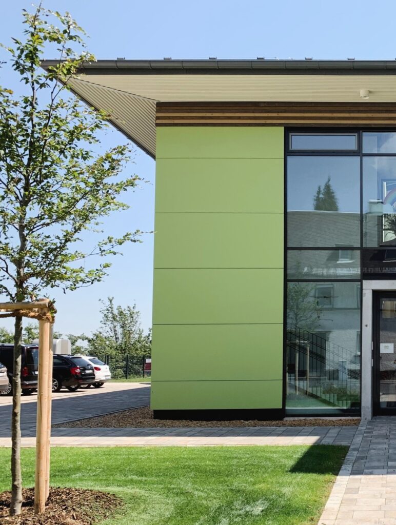 Dieses Kindergartenprojekt, das Platz für zwei Kindergarten- und zwei Krippengruppen bietet, repräsentiert das erste einer Reihe von drei baugleichen Einrichtungen.