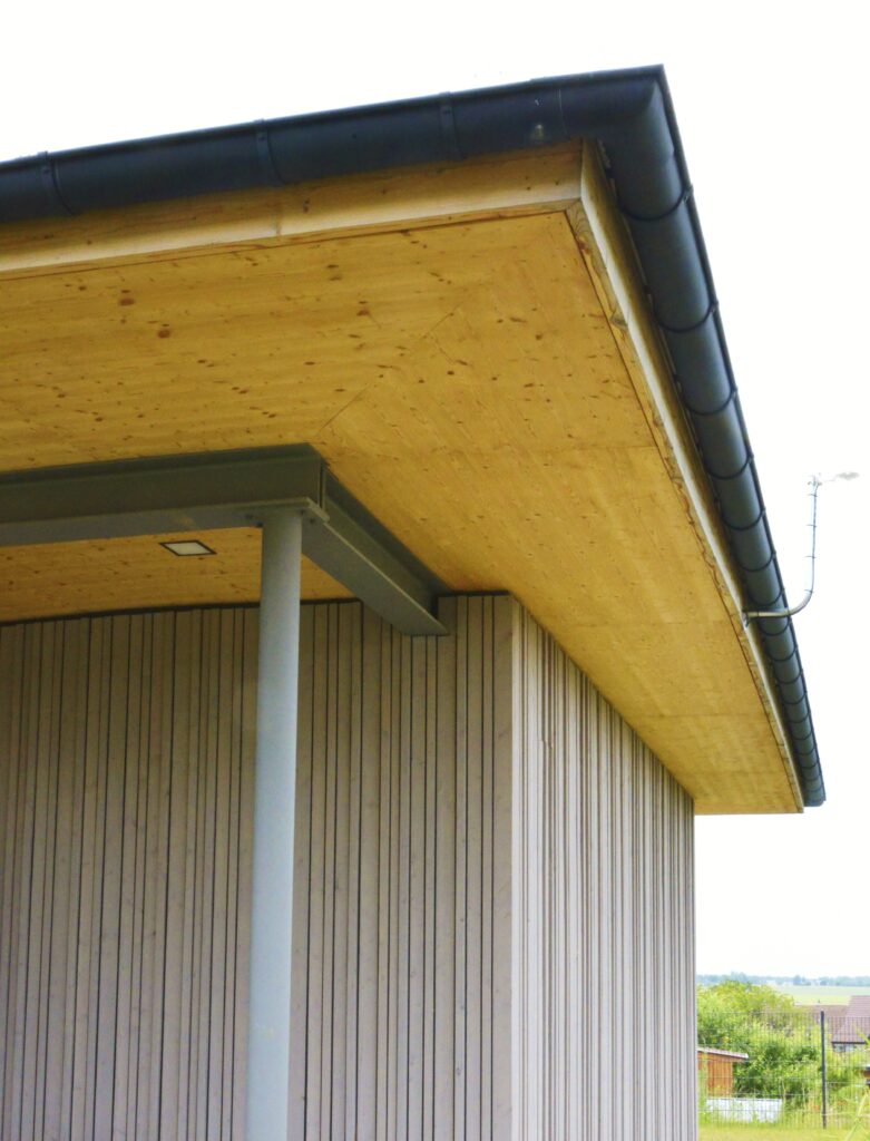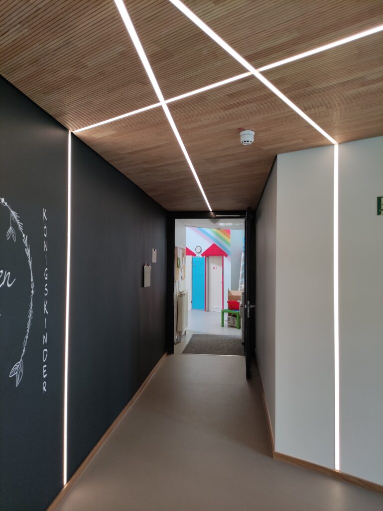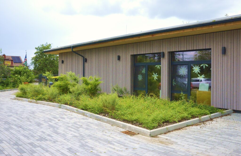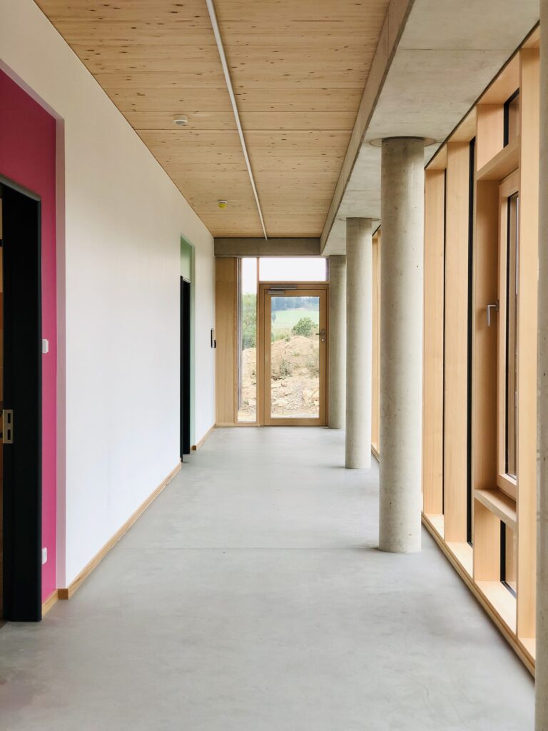 Die Erweiterung und der Umbau des Kindergartens in Töpen in den Jahren 2021 und 2022 haben das bestehende Gebäude um wertvolle Funktionen bereichert. Neben einem Mehrzweckraum und einem Kinderbistro wurden zwei zusätzliche Krippengruppen integriert, um den wachsenden Bedarf an Betreuungsplätzen zu decken. Eine komplexe Planungsaufgabe war die nahtlose Anbindung des Anbaus an den sechseckigen Grundriss des Bestandsgebäudes, welche mit einer innovativen Lösung gemeistert wurde. Die neu geschaffenen Bereiche zeichnen sich durch Helligkeit und großzügigen Lichteinfall aus, was eine freundliche und offene Atmosphäre schafft. Der Eingangsbereich in Y-Form ist nicht nur funktional, sondern auch ein gestalterisches Highlight: Er überrascht mit einem besonderen Lichtspiel und bietet eine interaktive, beschreibbare Wand, die zur Kreativität anregt. Die Verwendung von Massivholz für Dachüberstände und Decken sowie hochwertigen Akustikdecken unterstreicht den hohen Qualitätsanspruch. Die Kombination aus Sichtbeton in den Fluren und einem qualitativ ansprechenden Innenhof im Gartenbereich komplettiert das gelungene Projekt, das auch die großzügig erweiterte Außenanlage umfasst.