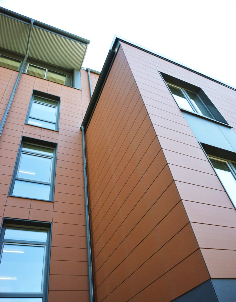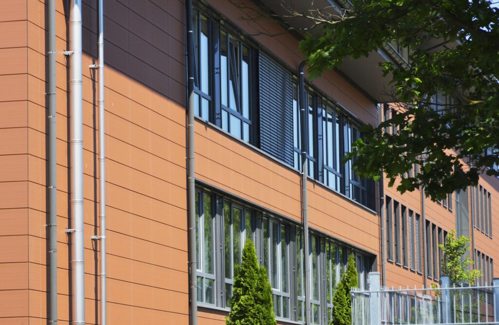 Das Ergebnis ist ein Campus, der durch seine neue Ziegelfassade eine moderne Ästhetik ausstrahlt. Diese Fassadengestaltung ermöglichte es, Neubauten und sanierte Bestandsgebäude optisch zu integrieren und ein einheitliches Erscheinungsbild zu schaffen. Durch den innovativen Umbau der Satteldächer zu Holzaufständerungen mit Flachdächern konnten im Dachgeschoss neue, hochwertige Nutzflächen gewonnen werden. Auch der Schulhof erfuhr eine umfassende Neugestaltung, die das Gesamtbild harmonisch abrundet.