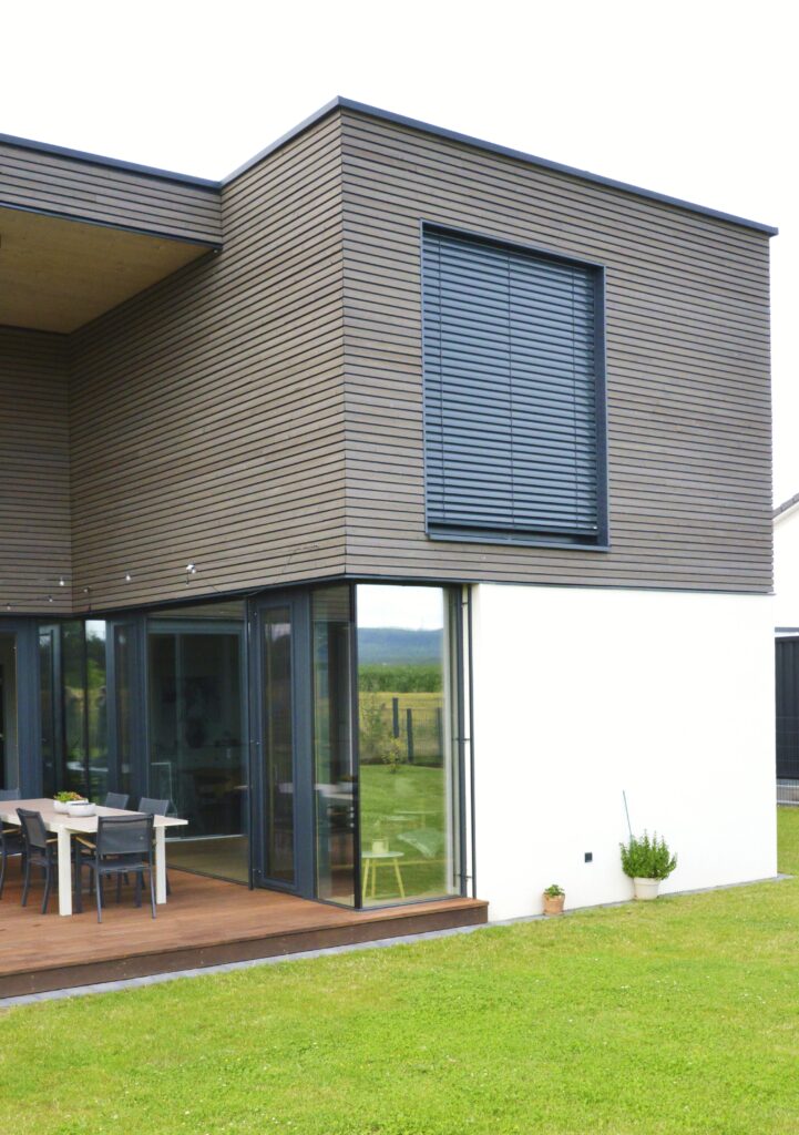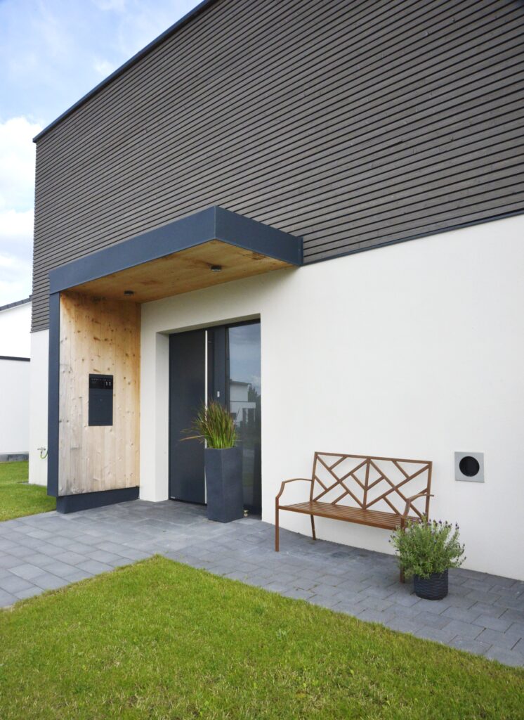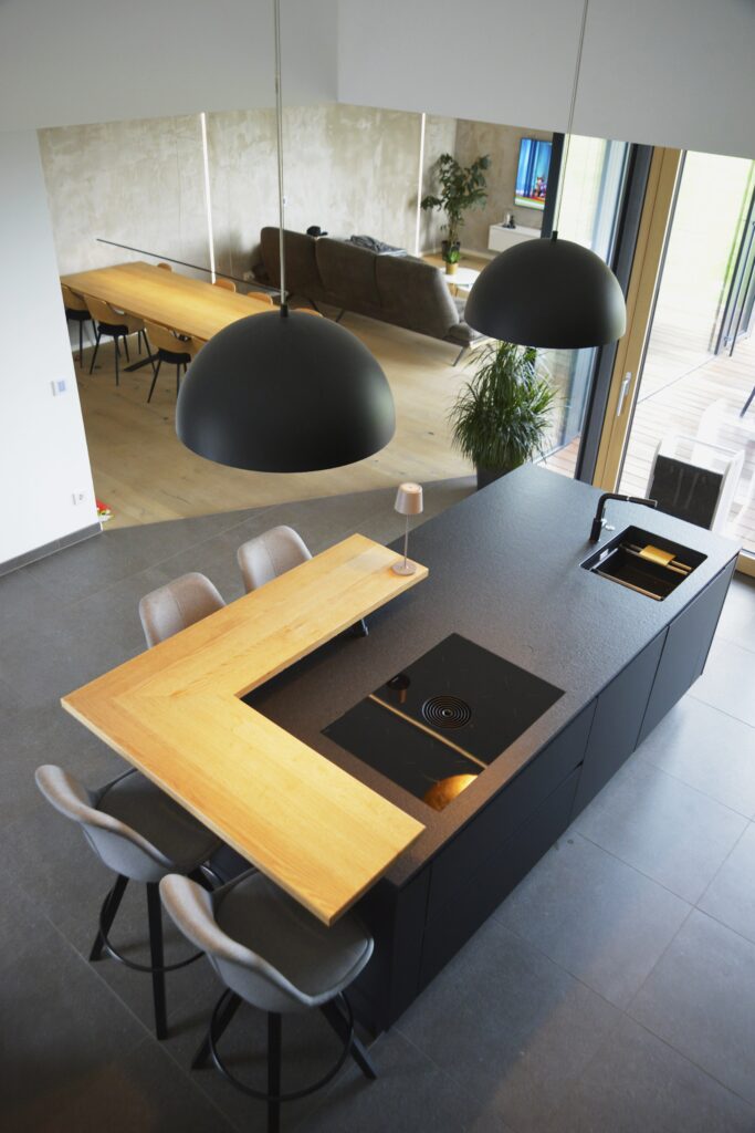 Die Fassade kombiniert eine warme Holzverkleidung im Obergeschoss mit einer klaren Putzfassade im Erdgeschoss, was dem Gebäude einen harmonischen und modernen Look verleiht. Bewusst wurde die Straßenseite eher geschlossen gehalten, während die Gartenseite mit weitläufigen Glasflächen beeindruckt und viel Licht ins Innere lässt. Die einzigartige Winkelform des Gebäudes schafft nicht nur eine erhöhte Privatsphäre für die Bewohner, sondern optimiert auch die Nutzung der Terrasse: Sie bietet Schutz vor Witterungseinflüssen und erhöht so die Aufenthaltsqualität im Freien. Im Herzen des Hauses befindet sich ein großzügiger Wohn- und Essbereich mit offener Küche, der zum Treffpunkt für die Familie wird. Eine elegante Sichtbetontreppe verbindet die Geschosse.