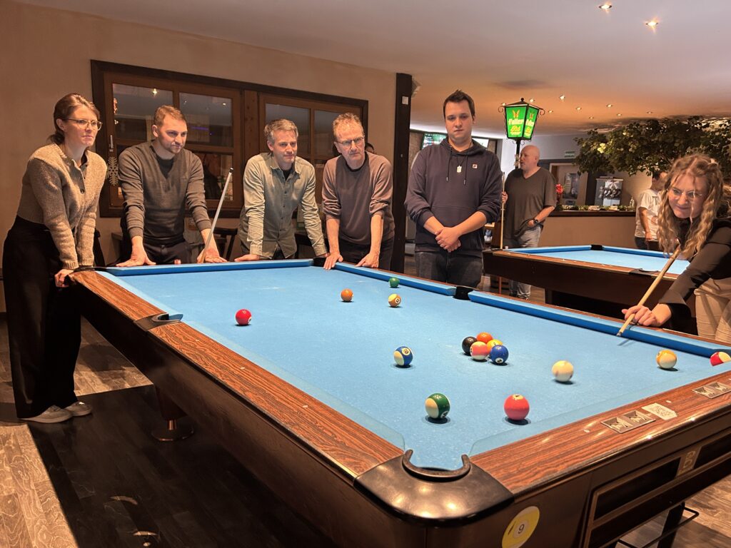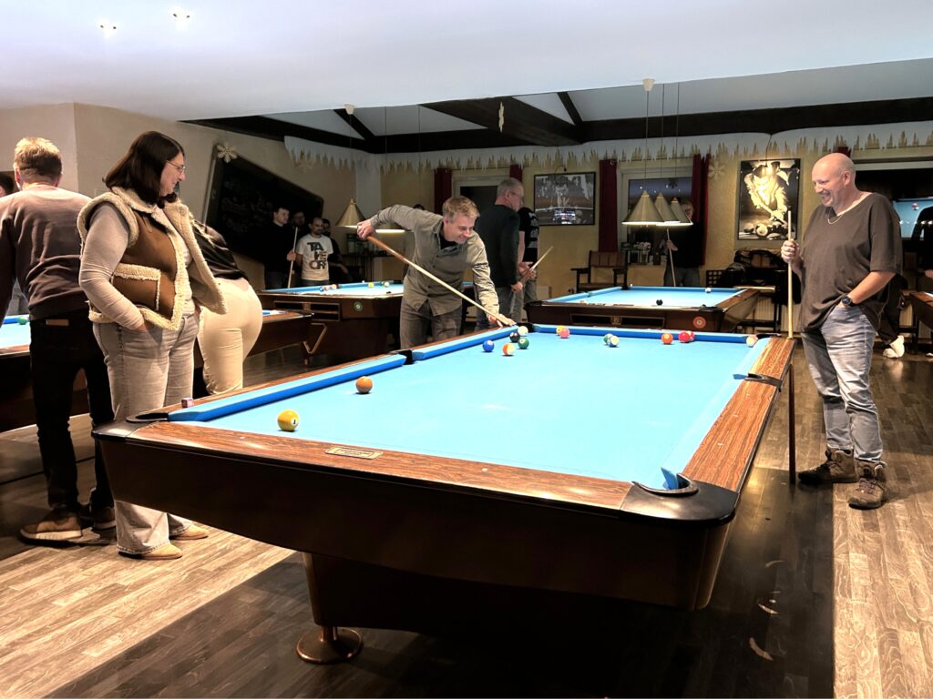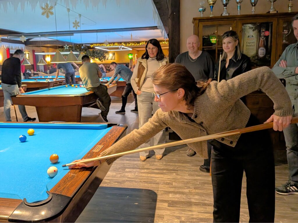 Unsere Weihnachtsfeier war eine schöne Gelegenheit, in entspannter Atmosphäre zusammenzukommen und das Jahr gemeinsam ausklingen zu lassen. Bei gutem Essen und vielen Gesprächen konnten wir abschalten, lachen und einfach mal Zeit miteinander verbringen. Später wurde es mit einer Runde Billiard und einer Portion spielerischem Ehrgeiz noch lebhafter.